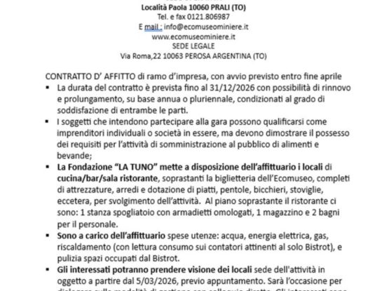 La Fondazione La Tuno, ente gestore operativo dell’Ecomuseo Regionale delle Miniere e della Val Germanasca, ha avviato una selezione per l’inserimento di una figura con il ruolo di operaio–manutentore presso il sito minerario ScopriMiniera – ScopriAlpi, situato nel Comune di Prali (TO), in località Paola.