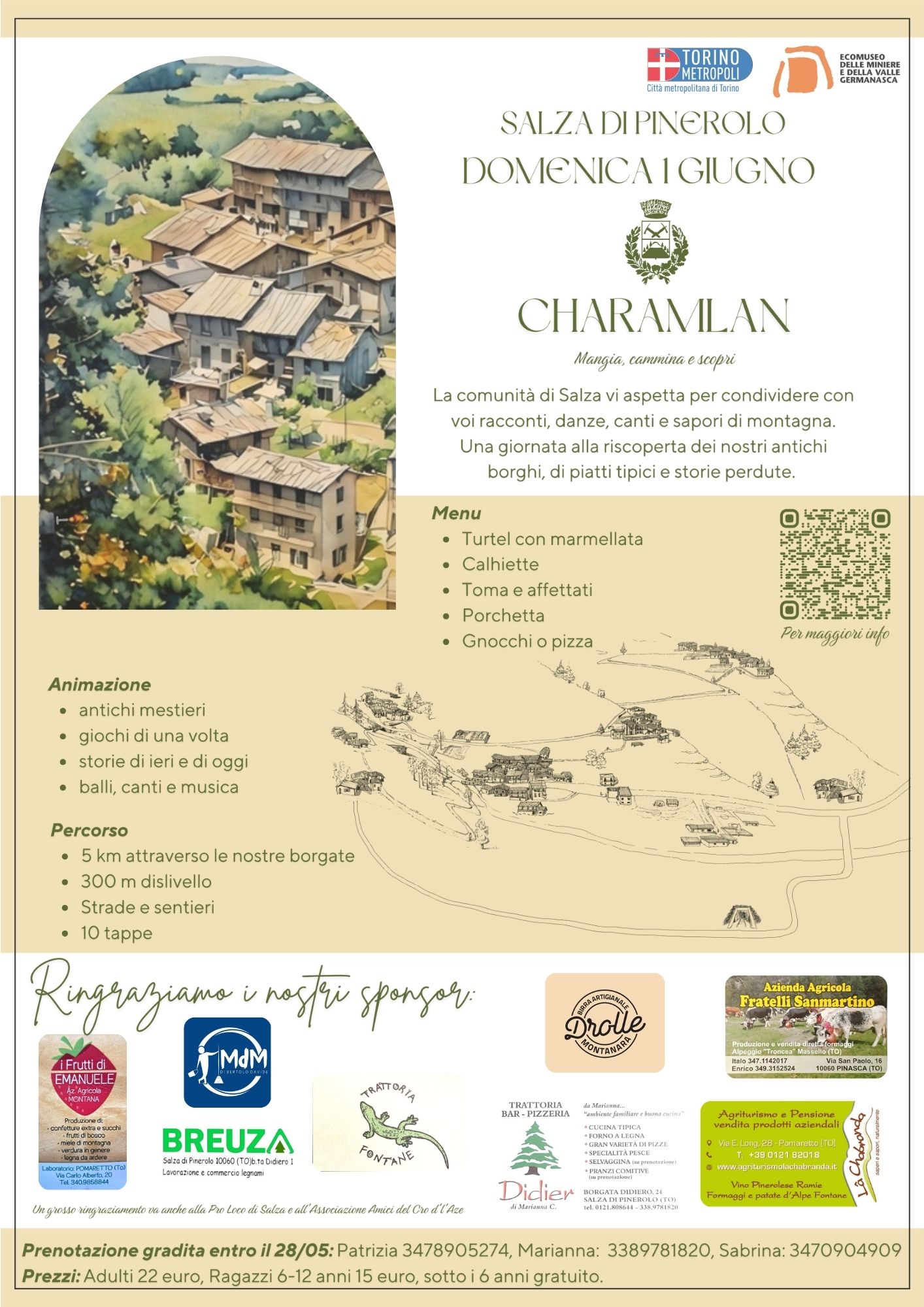 Una camminata ad anello di circa 5 km attraverso le suggestive borgate di Salza di Pinerolo, con circa 300 m di dislivello, pensata per far riscoprire il territorio, le sue storie, i suoi sapori e la sua comunità. Il percorso si snoda da Borgata Didiero verso Milan, Antouard (dove si trova l’imbocco della miniera Gianna), Meinie, Invers, Coppi, Serre, Chanfuran e ritorno a Deïdie.