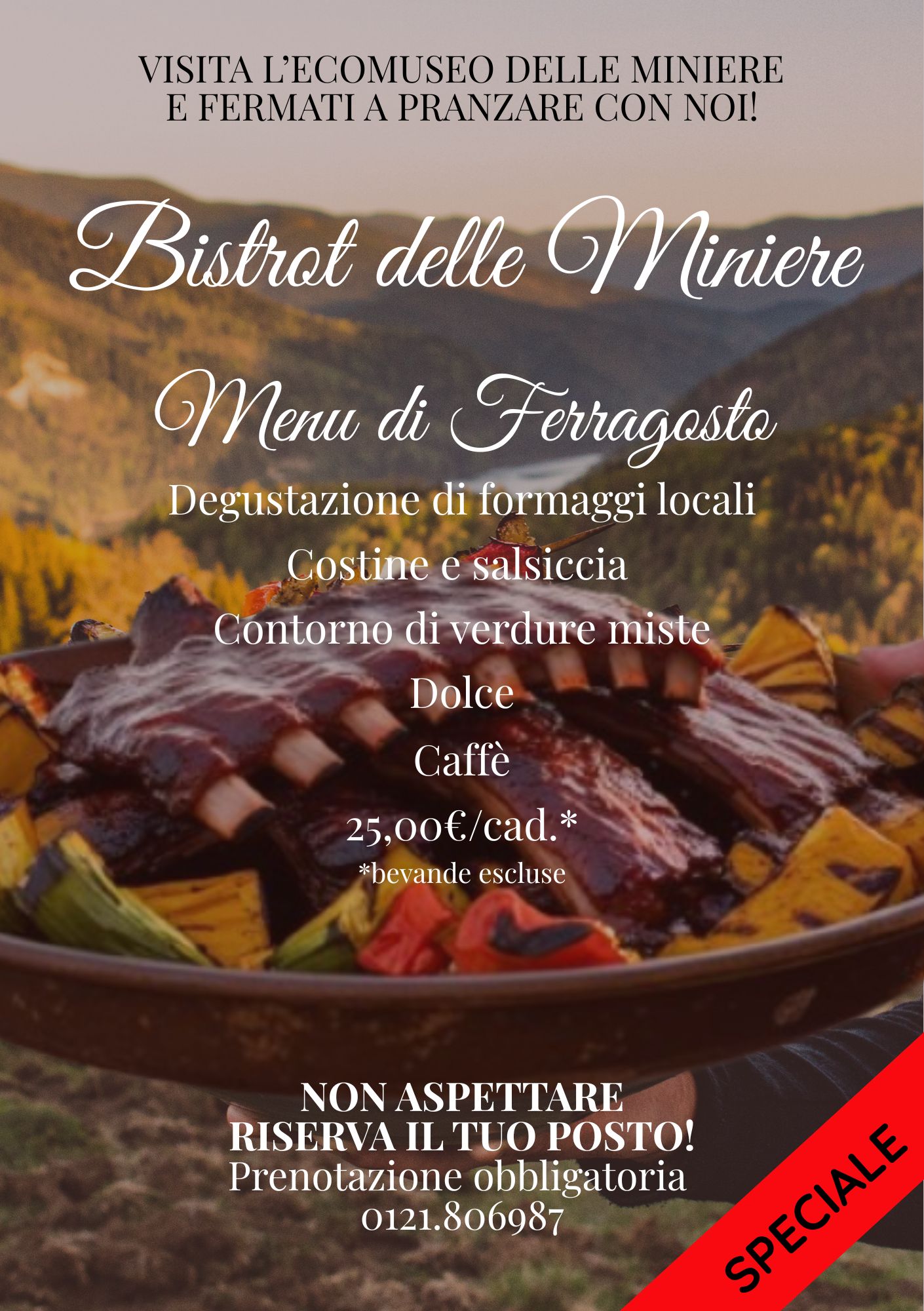 Se il giorno di Ferragosto hai prenotato una visita all’Ecomuseo delle Miniere ma non vuoi rinunciare al tradizionale pranzo con costine e verdure, fermati a mangiare con noi! Il Bistrot delle Miniere ha pensato a un menù speciale per rendere ancora più gustosa questa giornata di festa. Sapori genuini, atmosfera conviviale e piatti irresistibili ti aspettano! Prenota il tuo posto a tavola, i posti sono limitati!