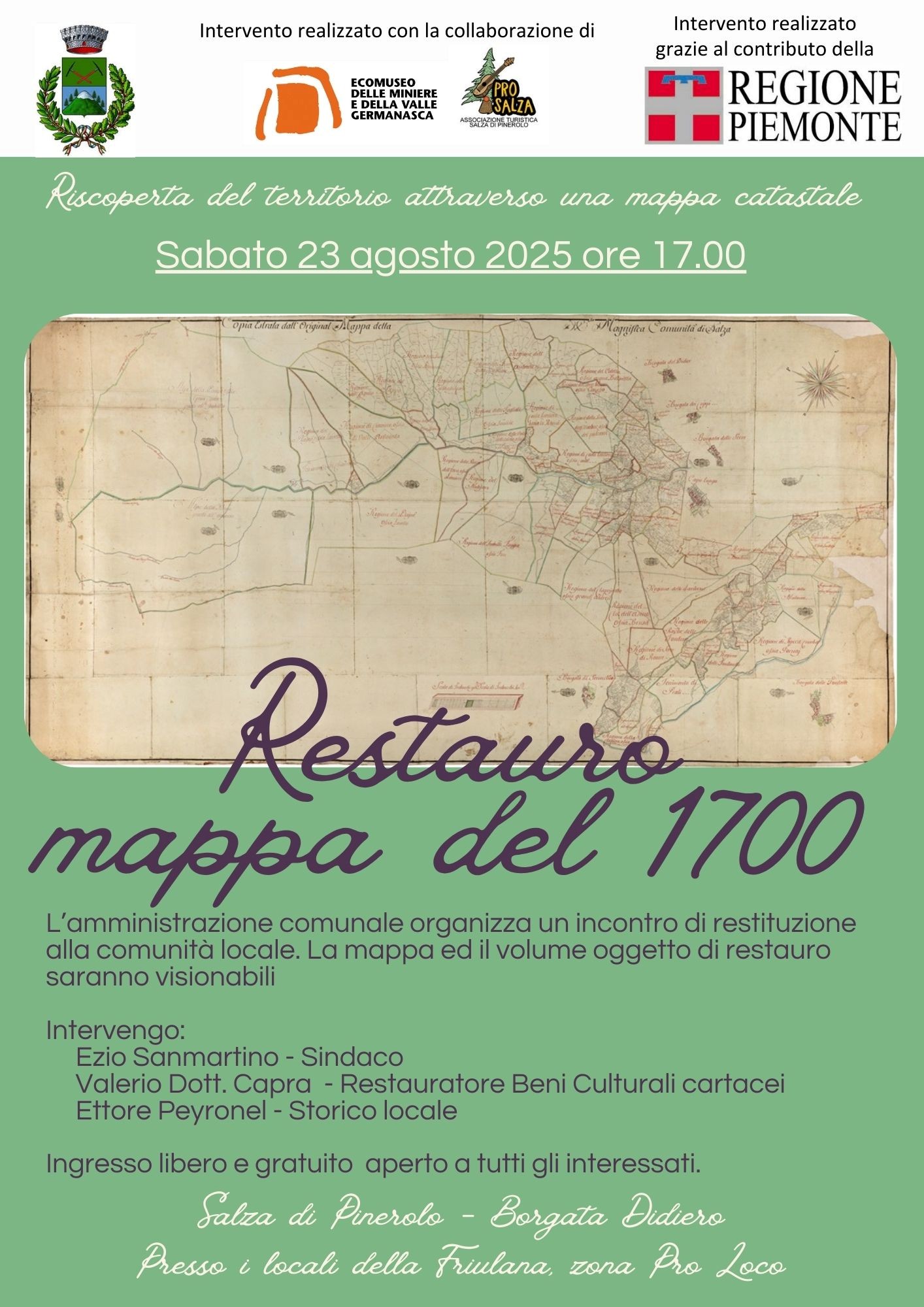 Salza di Pinerolo, Venerdì 23 agosto 2025, alle ore 17.00, presso i locali della Friulana, sarà presentato al pubblico il restauro di una preziosa mappa catastale del XVIII secolo, recentemente restituita alla comunità di Salza di Pinerolo.