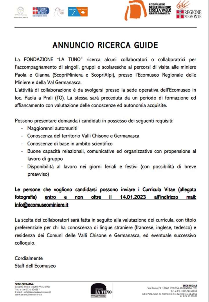 La FONDAZIONE “LA TUNO” ricerca alcuni collaboratori o collaboratrici per l’accompagnamento di singoli, gruppi e scolaresche ai percorsi di visita alle miniere Paola e Gianna (ScopriMiniera e ScopriAlpi), presso l’Ecomuseo Regionale delle Miniere e della Val Germanasca.